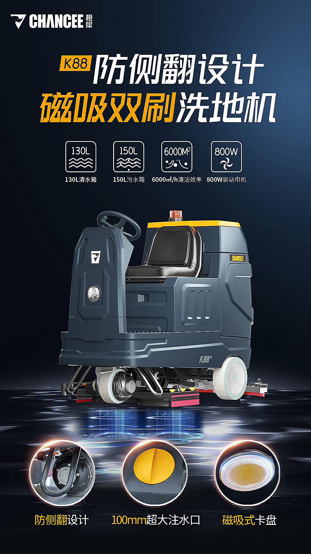 K88+采用獨(dú)特的磁吸式卡盤,裝卸方便,使用更可靠。機(jī)身防傾倒式保護(hù)裝置,可應(yīng)對多種斜坡路面。透明水位顯示計(jì),可肉眼識別水箱剩余水量。